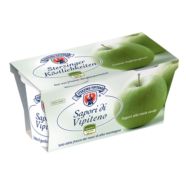 YOGURT DI LATTE INTERO con fermenti lattici vivi, preparato alla mela verde (mela e succo concentrato di mela 8% sul totale, zucchero, sciroppo di glucosio-fruttosio, amido modificato di mais, aroma). SENZA GLUTINE